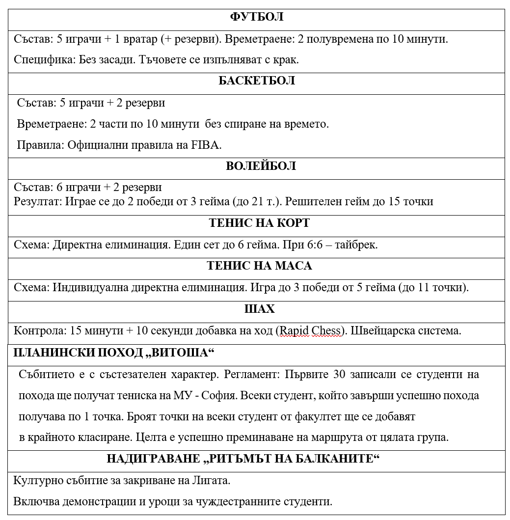 - Чл. 1. „Спортна лига на МУ-София“ е мащабно, многокомпонентно спортно събитие, организирано от ДЕОС.